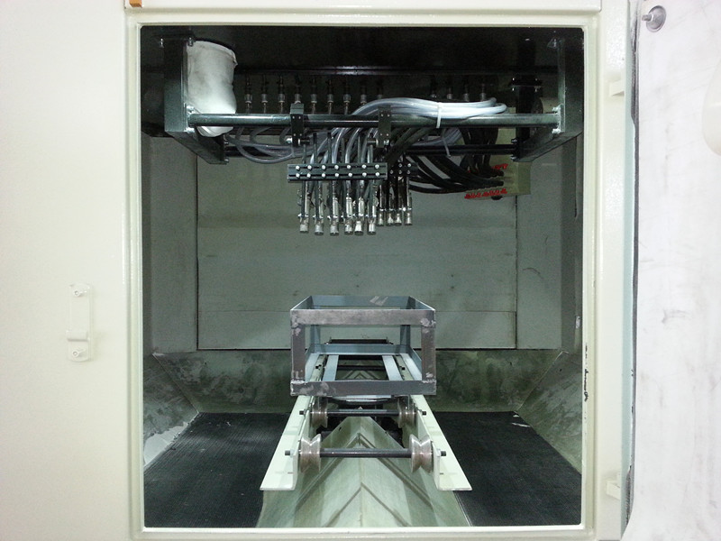 導(dǎo)軌旋轉(zhuǎn),工件放置于推車轉(zhuǎn)盤上,轉(zhuǎn)盤的旋轉(zhuǎn)速度視工件噴砂效果可予調(diào)節(jié)。